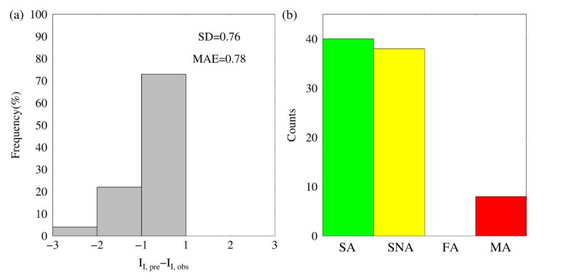 (4)為了驗(yàn)證本文提出的方法的魯棒性,我們將該方法應(yīng)用到中國(guó)訓(xùn)練數(shù)據(jù)集和測(cè)試集之外的五次破壞性地震事件中。基于本文提出的方法,在P波到達(dá)后3秒,圖3展示2022年門(mén)源6.9級(jí)地震的儀器地震烈度預(yù)測(cè)結(jié)果及警報(bào)性能。從圖3中可以看到:預(yù)測(cè)的儀器地震烈度和觀(guān)測(cè)地震烈度是非常接近的,且基于預(yù)測(cè)的儀器地震烈度,只發(fā)生了一次漏報(bào),且沒(méi)有誤報(bào)現(xiàn)象。同時(shí),圖4展示了這五次破壞性地震事件的儀器地震烈度預(yù)測(cè)誤差和警報(bào)情況。從圖4中可以發(fā)現(xiàn):P波到達(dá)3s后,儀器地震烈度預(yù)報(bào)誤差主要在±1以?xún)?nèi),平均絕對(duì)誤差為0.78;成功報(bào)警的比例達(dá)到90%,誤報(bào)警的比例為0%。研究表明:本文的研究對(duì)于現(xiàn)地地震預(yù)警是有幫助的。