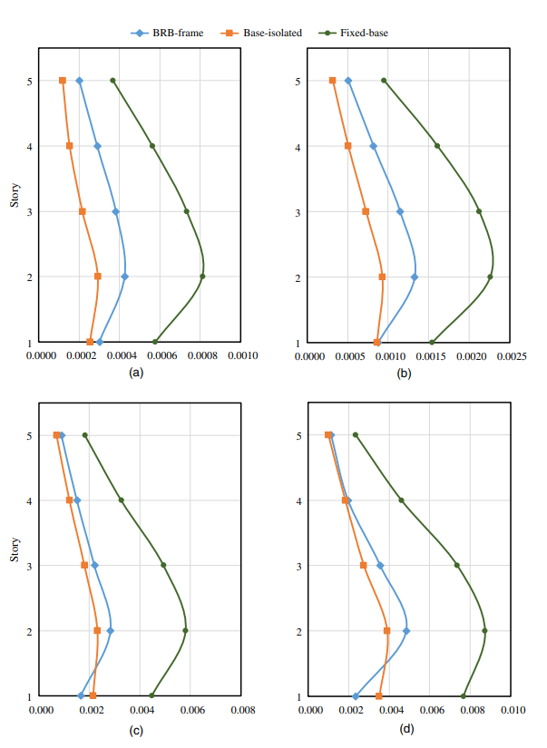 依據(jù)FEMA P-58抗震性能評估理論,選擇基于強度的評估方法,對比了普通框架結(jié)構(gòu)、BRB-框架結(jié)構(gòu)、隔震框架結(jié)構(gòu)在四個地震動強度下的結(jié)構(gòu)響應情況及地震性能評估與損失進行了對比評估。
